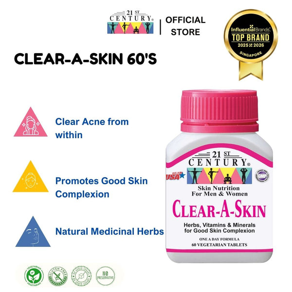 Clear-A-Skin is a special formulation of natural medicinal herbs with vitamins and minerals to improve complexion and specifically to get rid of pimples and acne eruptions. It is the only formula of its kind in the world, developed by 21st Century HealthCare USA's research labs.